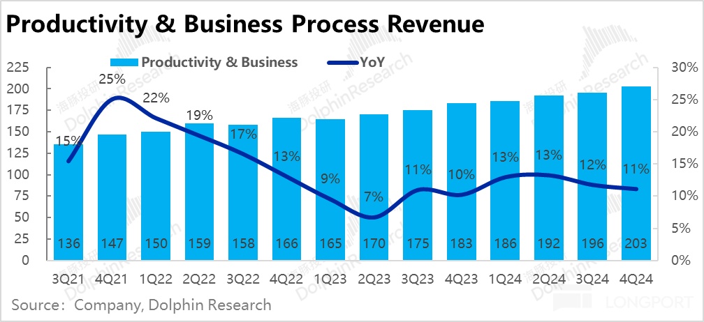 整体上,由于 AI 功能未能推进 Commercial Office 这一核心业务的提速,其他业务中大多数也平稳放缓。本季生产力流程板块营收增长 11%,较上季继续降速 1pct,算是预期之内的无亮点。