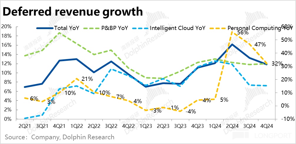 尚未确认收入(递延收入)指标中,P&BP 板块同比增长仍大体持平,但智慧云和个人计算板块都出现了明显的下滑,导致整体递延收入增速进一步下滑 1pct 到 12%。且其中还包含了因并购导致游戏递延收入暴增的影响。