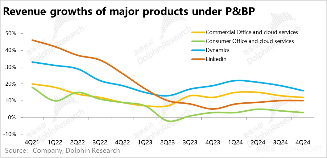 生产力板块中的其他业务中:① 个人 Office 增速在低个位数的水平继续下滑,② Dynamics 的增速同样放缓了 3pct,但 16% 的增速仍是 PBP 板块中增长最快的业务;③ LinkedIn 继续维持 10% 的增速。