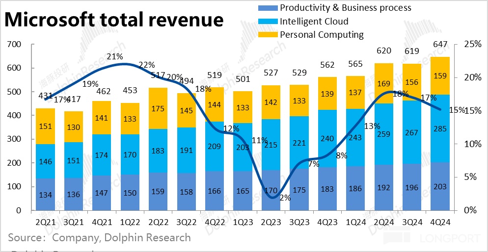 细分业务上: ① Windows OEM 业务收入同比增长了 4%,和 PC 出货量增速大体一致。虽然微软已推出了第一批的 “AI PC” 产品,但在 2C 端爆款 AI 应用诞生前,显然不能立刻驱动 PC 的换新周期;
