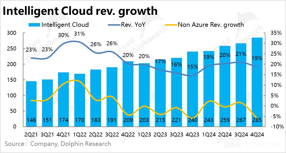 不过据我们测算,智慧云板块内非 Azure 业务本季度收入增长再度同比转负到约-6%。海豚投研从外行调研中国也关注到目前企业的 IT 投入预算虽已重回增长趋势,但其中相当部分都是用于 AI 相关的投入,导致投向传统需求的预算仍比较紧张。