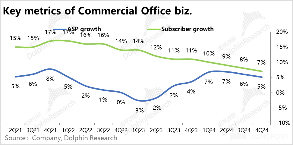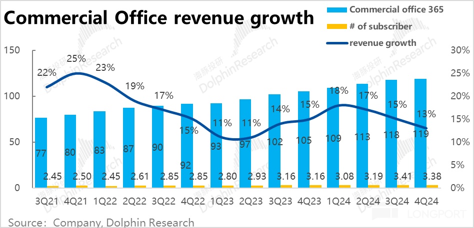 从量价角度拆分来看:1)本季企业 Office 365 订阅客户数同比增长继续放缓到 7%,由于用户渗透率趋于饱和和并不算好的宏观经济预期,用户增长趋缓也已是市场普遍预见到的问题之一。