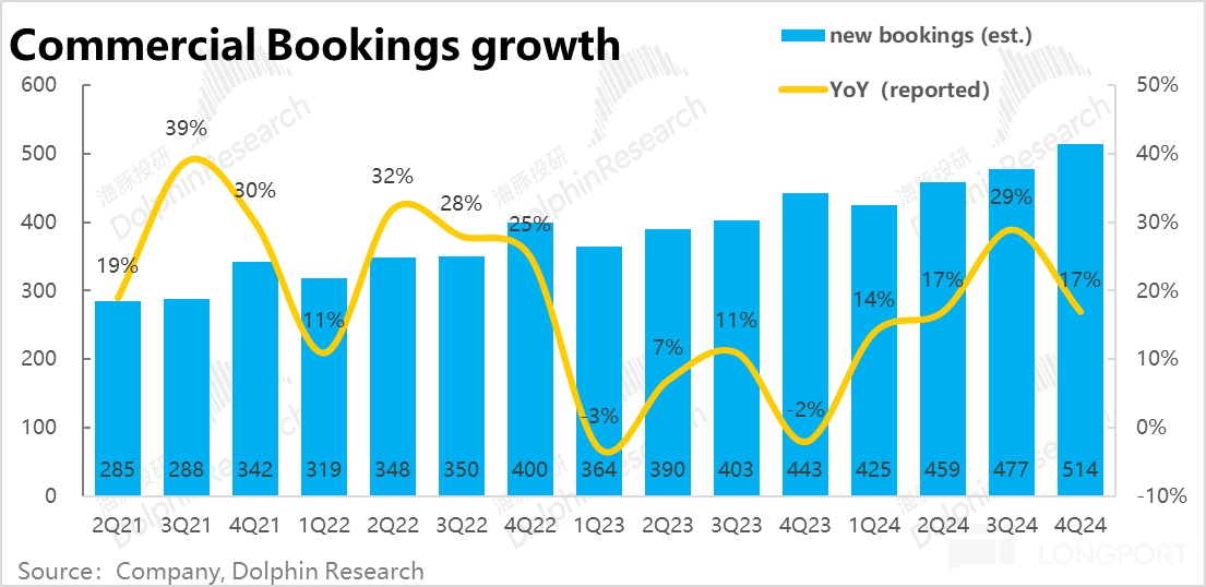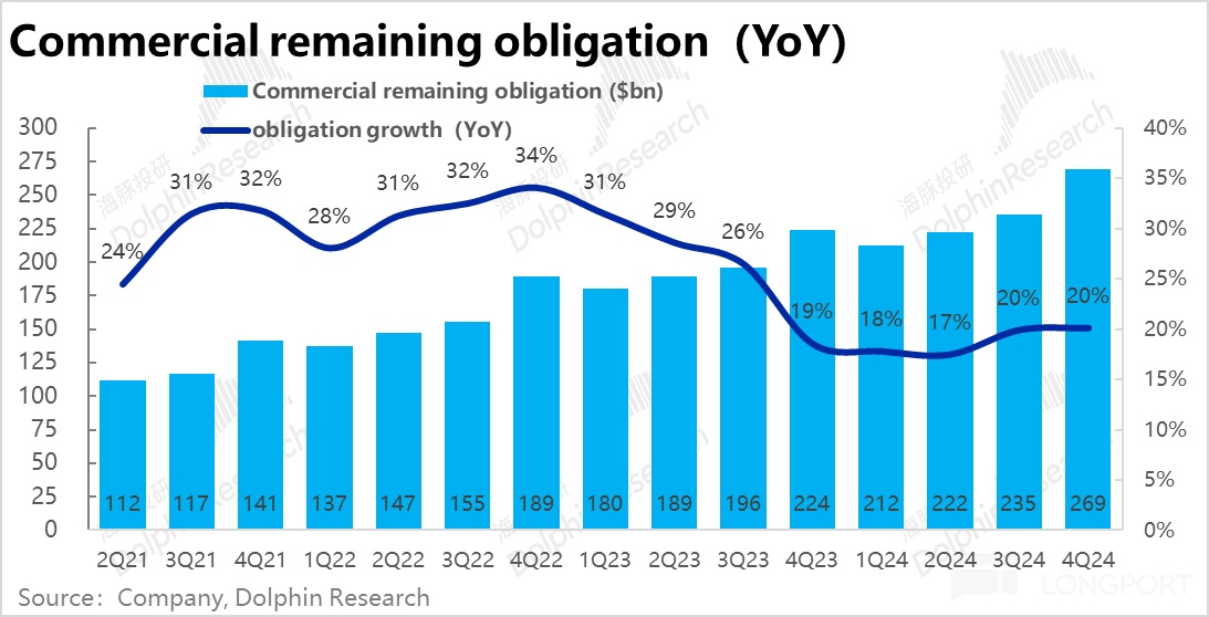 不过,存量的待履约合同余额 (即已收到付款未确认收入的递延收入 + 未收到付款但已签订合同的金额)本季为 2350 亿,同比增速则是持平在 20%。虽然当季新增合同放缓,但存量角度尚未出现明显问题。