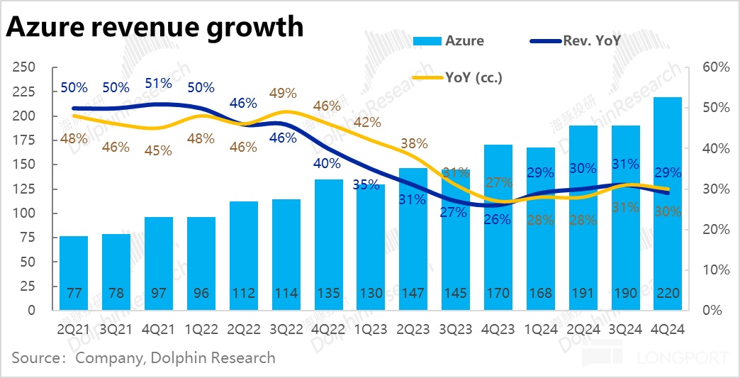 随着微软(包括其他大科技股估)值不断走高,且传统业务增速和宏观经历都并非乐观的情况下,无论是对业绩还是估值的支撑,可以说全系于 Azure 一身。业绩前外资行对 Azure 的预期也普遍乐观,但实际是 Azure 本季的同比和恒定汇率下增速分别为 29% 和 30%,虽绝对而言增速并不差,但增速分别环比下降了 2pct 和 1pct,相比相当一部分偏乐观投资人原本预期的增长加速,从预期差的角度显然多少是让人失望的。