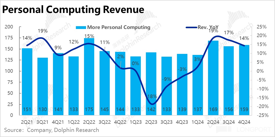 个人计算板块的本季营收同比增速为 17%,剔除收购影响原有业务可比增速为 2% 和上季基本持平,个人计算板块仍在低位增长。实际营收比市场预期略多 4 亿,但无关大局。