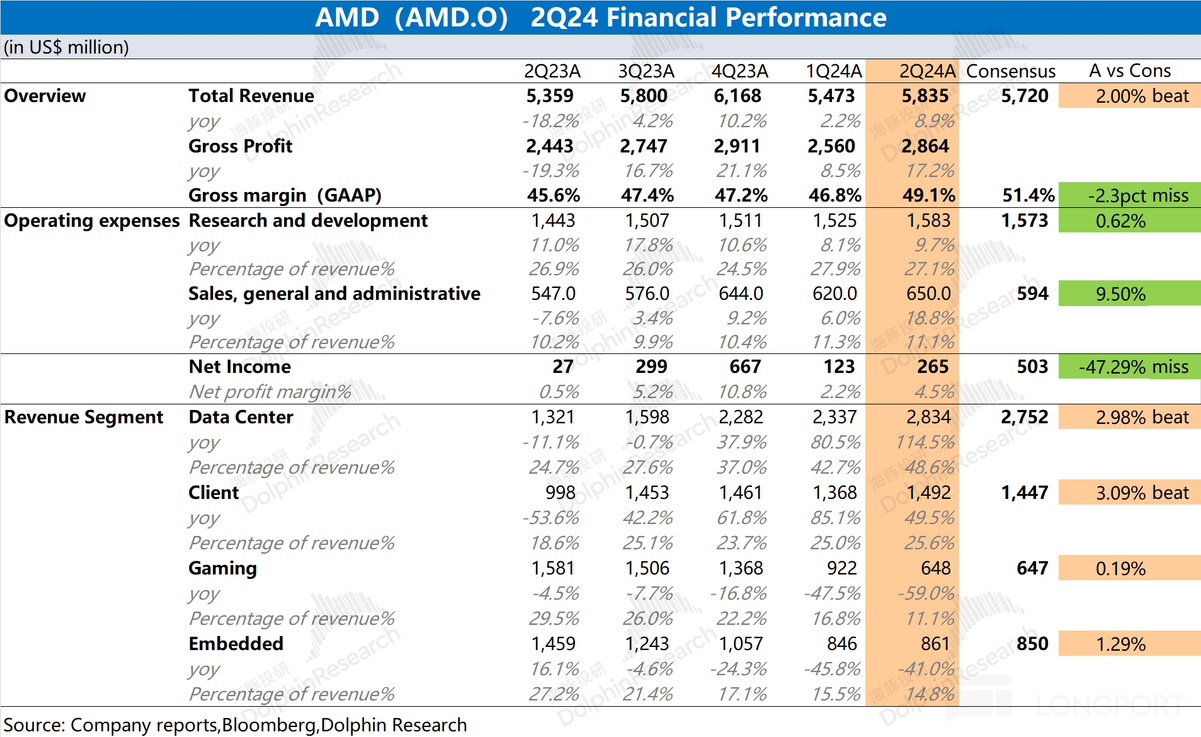 AMD(AMD.O)于北京时间 2024 年 7 月 31 日上午的美股盘后发布了 2024 年第二季度财报(截止 2024 年 6 月),电话会要点如下: