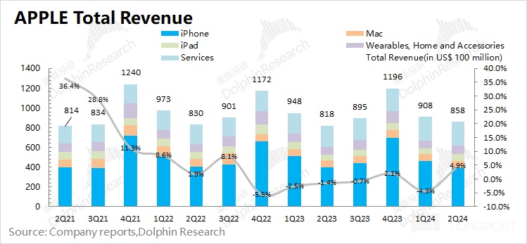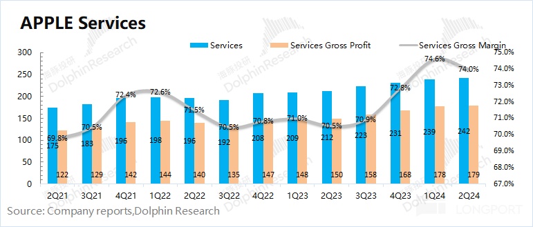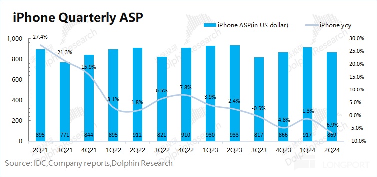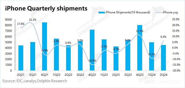 1)iPhone 出货量:根据 IDC 的数据,2024 年第二季度全球智能手机市场同比增长 7.6%。苹果本季度出货量增速为 6.4% 左右,公司的出货量增长表现稍逊于整体市场;