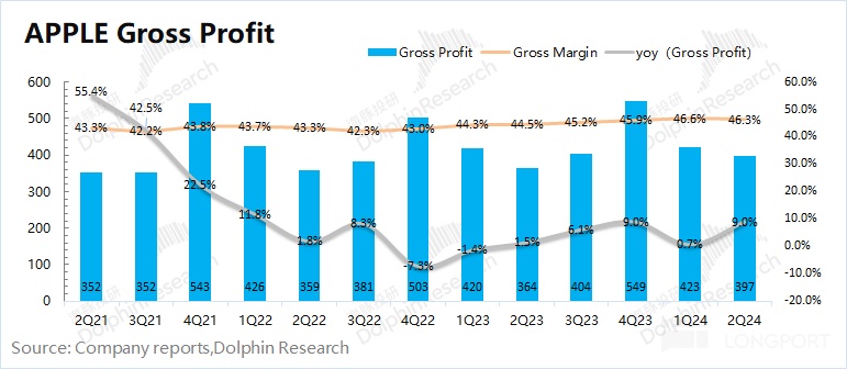 1.2 毛利率:2024 财年第三季度(即 2Q24)苹果公司毛利率 46.3%,同比增加 1.8pct,略好于市场一致预期(46.1%)。公司毛利率继续回升,主要是因为软件业务走高的推动。