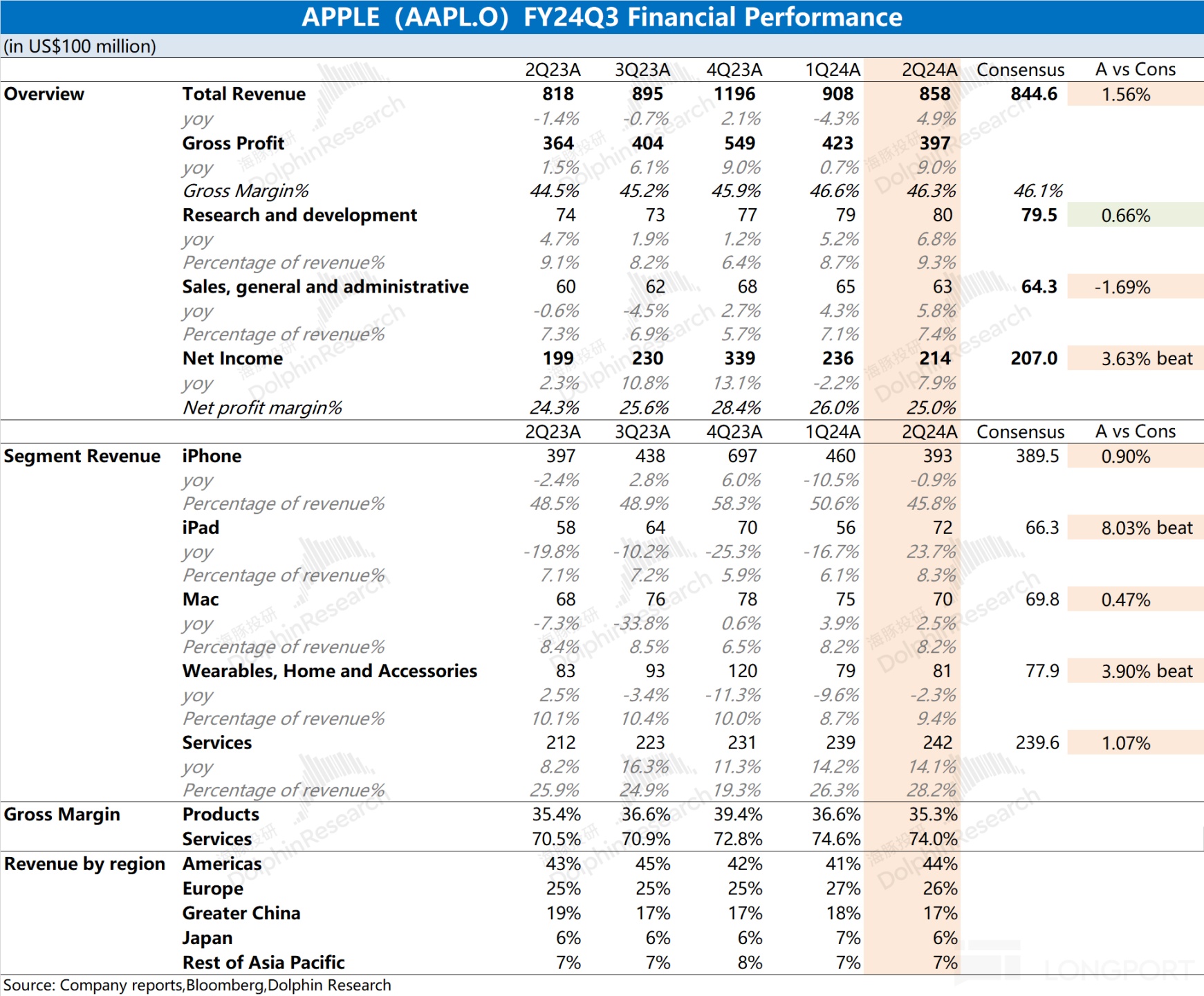 1.1 收入端:2024 财年第三季度(即 2Q24)苹果公司实现营收 858 亿美元,同比增长 4.9%,略好于市场一致预期(844.6 亿美元)。公司本季度收入端的提升,主要受益于 ipad 及软件服务业务的增长带动。虽然大中华区收入仍有下滑,但其他地区收入都有不同程度的增长表现。