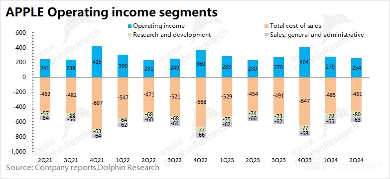 1.3 经营利润:2024 财年第三季度(即 2Q24)苹果公司经营利润 254 亿美元,同比增长 10.2%。苹果公司本季度经营利润的增长,是受收入和毛利率提升的带动。