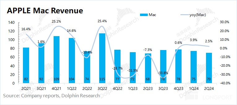 2024 财年第三季度(即 2Q24)Mac 业务收入 70 亿美元,同比增长 2.5%,符合市场预期(69.8 亿美元)。