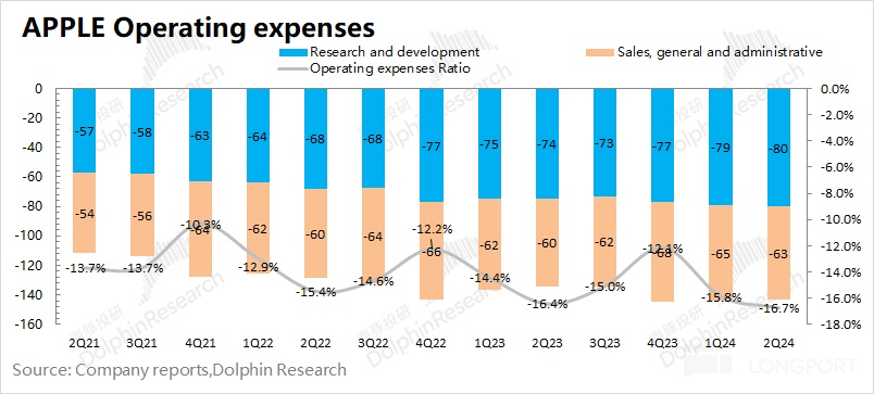 本季度苹果公司的经营费用率 16.7%,同比增长 0.3pct。本季度公司的销售费用和研发费用同比均有一定的提升。