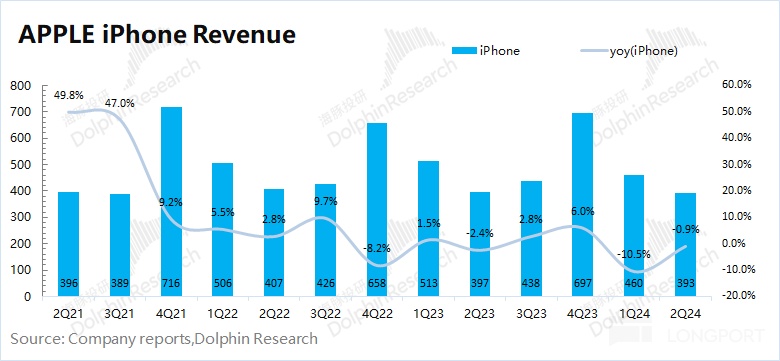2024 财年第三季度(即 2Q24)iPhone 业务收入 393 亿美元,同比下滑 0.9%,符合市场一致预期(390 亿美元)。本季度全球手机市场出货量同比有个位数增长,而公司的手机业务仍有下滑的,主要是受价格端降价促销的影响。