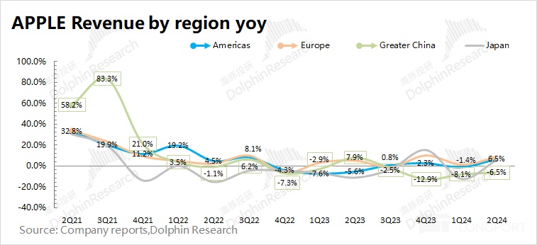 从各地区来看:本季度苹果在大中华区仍在下滑,而在其他地区都有不同幅度的增长表现。公司在大中华区,仍面临着市场需求仍然不足以及竞争加剧的影响。具体来看,美洲地区是苹果的最大收入来源,本季度增长 6.5%;而大中华区的收入再次下滑 6.5%。