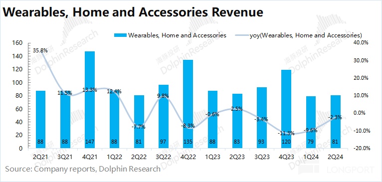 2024 财年第三季度(即 2Q24)可穿戴等其他硬件业务收入 81 亿美元,同比下滑 2.3%,好于市场一致预期(78 亿美元)。虽然苹果的可穿戴等其他硬件业务本季度继续下滑,但下跌幅度明显收窄。结合高通的同比下滑 8.5% 的 IoT 业务来看,整体市场需求仍然低迷,但苹果表现相对好于安卓系。