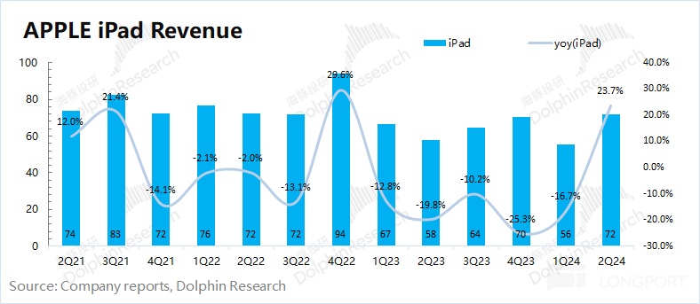 2024 财年第三季度(即 2Q24)iPad 业务收入 72 亿美元,同比增长 23.7%,超市场一致预期(66.3 亿美元)。5 月 iPad 新品发布,带动 iPad 业务回暖,季度影响重新站上 70 亿美元。新一代的 iPad Pro 换用 OLED 屏幕,并从 M2 直接升级至 M4,带动市场需求回升。