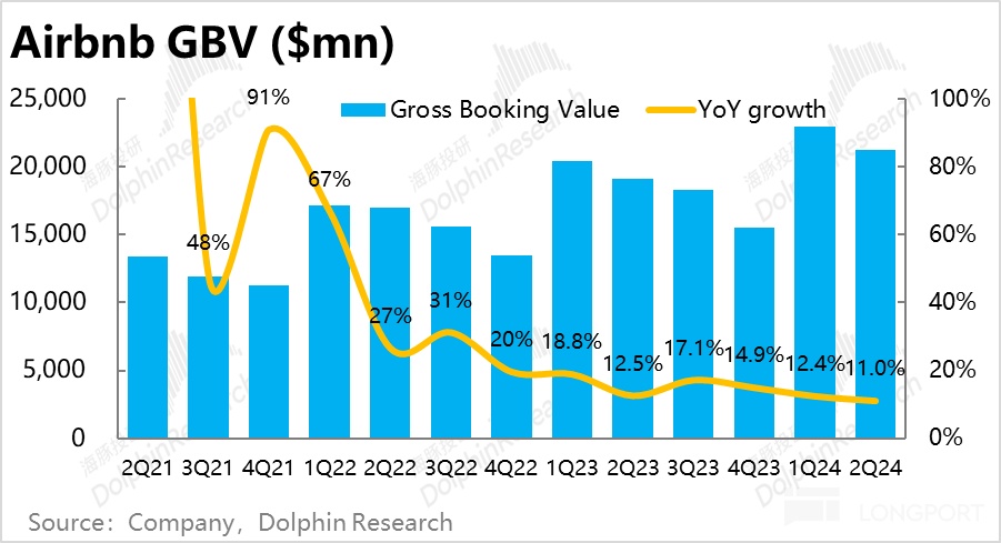 1、关键经营指标,本季度爱彼迎的总预定金额约$212 亿,同比增速由上季的 12.4% 进一步放缓到 11%,不过市场预期放缓的程度更深,实际表现比更保守的预期稍好。