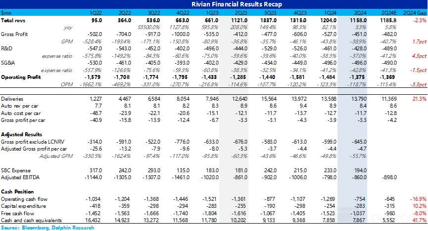 3. 继续保持 2024 年指引不变,预计第二代 R1 相比第一代 R1 原材料端下滑 20%:Rivian 继续保持 2024 年指引不变,以及继续保持 2024 年四季度毛利率转正的目标,海豚君经过测算,认为 Rivian 4Q24 报表端毛利率转正目标可以勉强完成,但对升级后的 R1 需求仍是目标能否实现的关键因素。