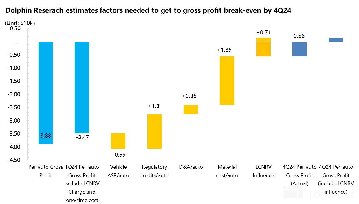 经海豚君测算,如果按照公司预期的原材料成本下降 20%,加上监管积分/单车固定成本下降影响,真实毛利率难以转正,但考虑到 LCNRV 冲回,报表端毛利率预计可以勉强实现转正,报表端毛利率预计 1.6% 左右。