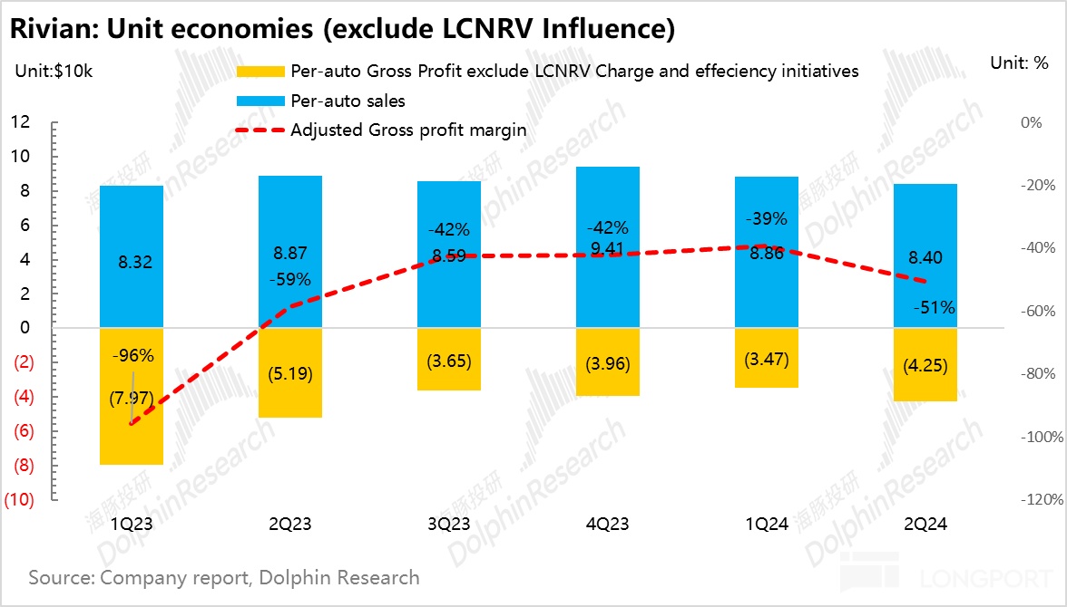 投资者今年最关心的仍是二季度停产对于成本的削减程度,以及对于四季度毛利率转正计划能否成功完成,本季度 Rivian 给了一个具体指引,预计第二代 R1 相比第一代 R1(与 Q1 2024 比较)在原材料成本端有 20% 的节省,海豚君根据单车经济情况做了一个初步的测算: