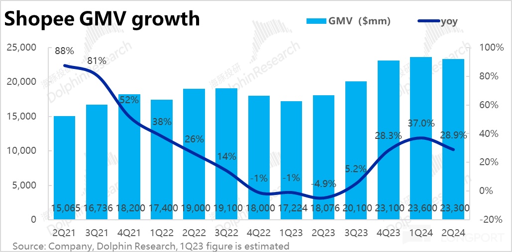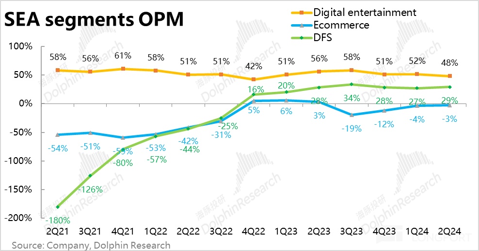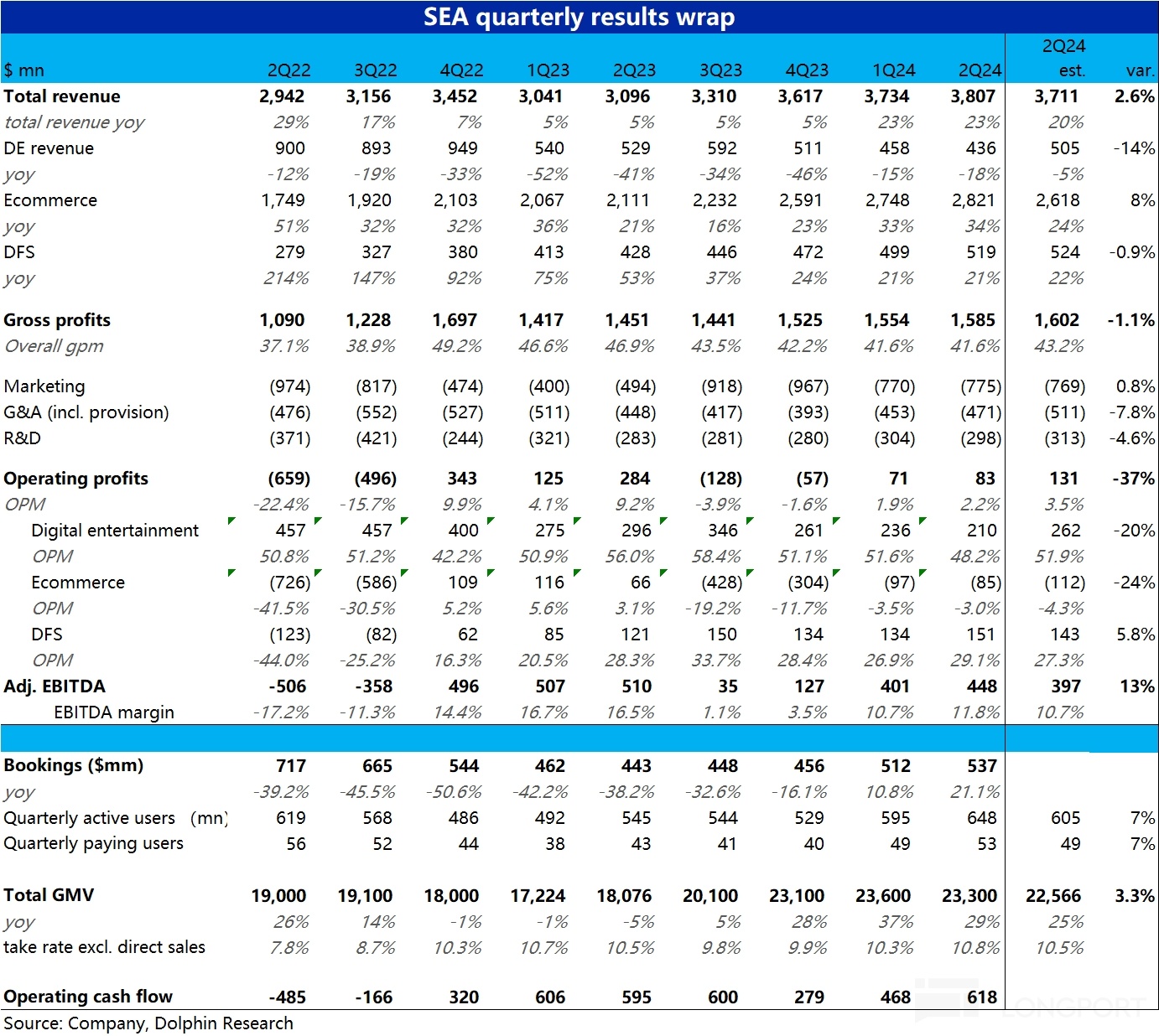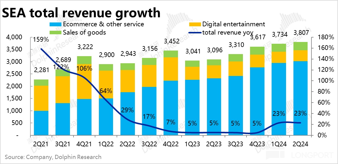 主要由于电商板块比预期更强的增长,本季 Sea 整体实现收入 38.1 亿,同比增长 23%,和上季度持平并未放缓,比市场预期的增速高 3pct。