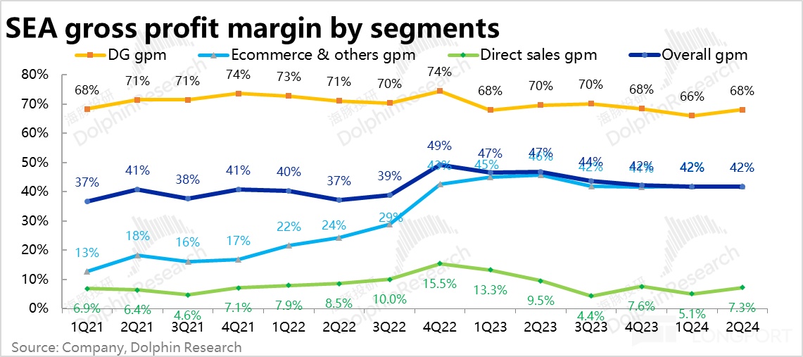 毛利层面,本季公司整体实现毛利润 15.9 亿,毛利率环比大体持平在 42%,并未像市场预期的环比有所提升。但细分来看,游戏和自营零售业务的毛利是环比提升的,电商和金融业务的毛利也环比持平。换言之,各细分业务的毛利率实际是持平或改善的,但公司整体毛利率原地踏步是因为营收结构中低毛利业务的比重上升导致的。