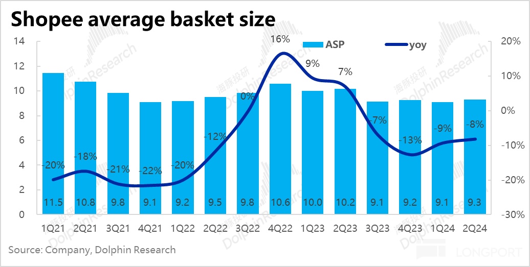 1、最关键的 Shopee 电商板块,本季GMV 为 233 亿,虽因季节性因素环比略降,但相比更保守的市场预期高出约 4.3 亿。价量驱动上维持着以价换量的趋势,相比前两个季度没有明显变化。不过环比来看,Shopee 的 GMV 规模已连续 3 个季度没有明显增长,需要关注 Shopee 的增长是否再度进入了瓶颈期。