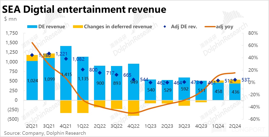 初看之下Garena 的 GAAP 口径下收入本季同比下滑了 18% 到 4.36 亿,明显低于市场预期的 5.1 亿。但这主要是递延收入变动的影响,相比过去几年 GAAP 口径收入持续从递延收入池中 “抽水”,本季新增递延收入达到 1 亿。