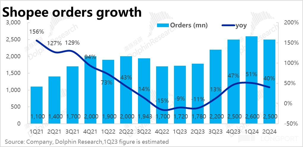 拆分价量来看,本季订单量为 25 亿,环比上季度略降,但更低基数下同比增速达到 40%,仍是明显跑赢 GMV 增长。