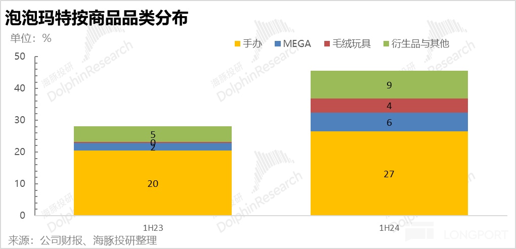 今年上半年,它 Labubu 的毛绒公仔也开始起量,多品类增长的带动下,手办的收入占比已经从去年同期的 70%+ 下降到了不足 60%。
