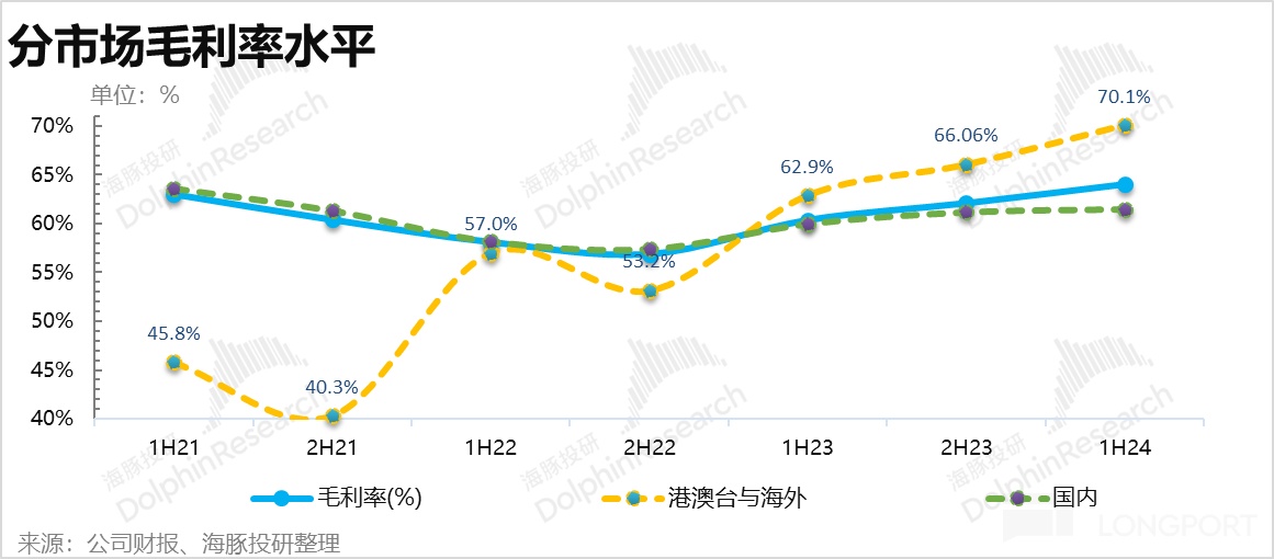 但更加令人激动的是,海外市场因为定价高,毛利率还更高:国内业务的毛利率也就是 60% 上下的水平,海外业务毛利率几乎比国内高出 10 个百分点!随着海外批发业务占比越走月低,海外业务毛利率站上 72%,确定性非常高。
