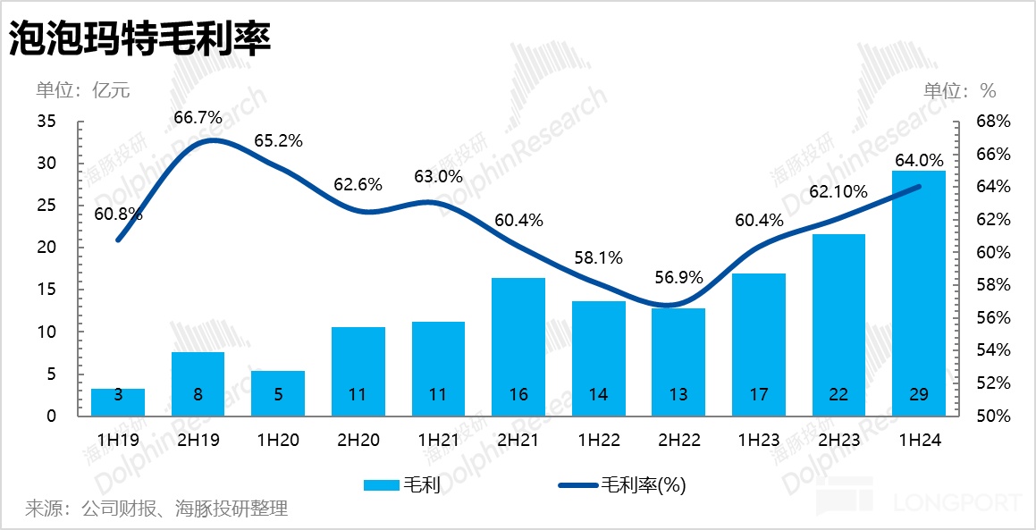 海外爆发性上,今年上半年 260% 的同比增速,甚至相比去年下半年都不止翻番,震撼力肉眼可见。贡献分量上,海外才刚做了两年、自营门店才刚过 80 家,30% 的收入贡献、33% 的毛利润贡献。这个趋势下去,可能不止再造一个泡泡玛特。