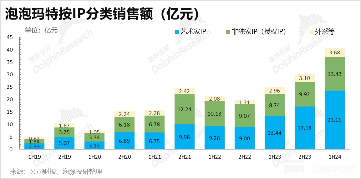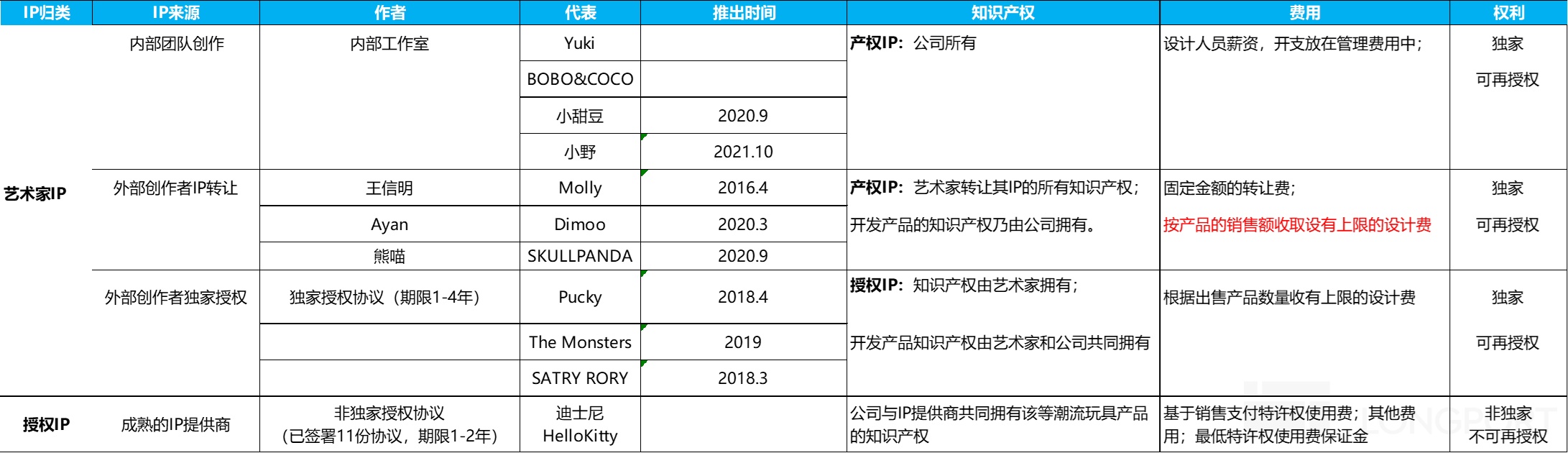 泡泡玛特从 IP 的角度,主要分自有 IP、独家和非独家,其中自有 IP 和独家 IP 是泡泡玛特的核心竞争力,上次的披露口径调整之后,把独家和自有 IP 统称为艺术家 IP。通常这类 IP 的毛利率更高。