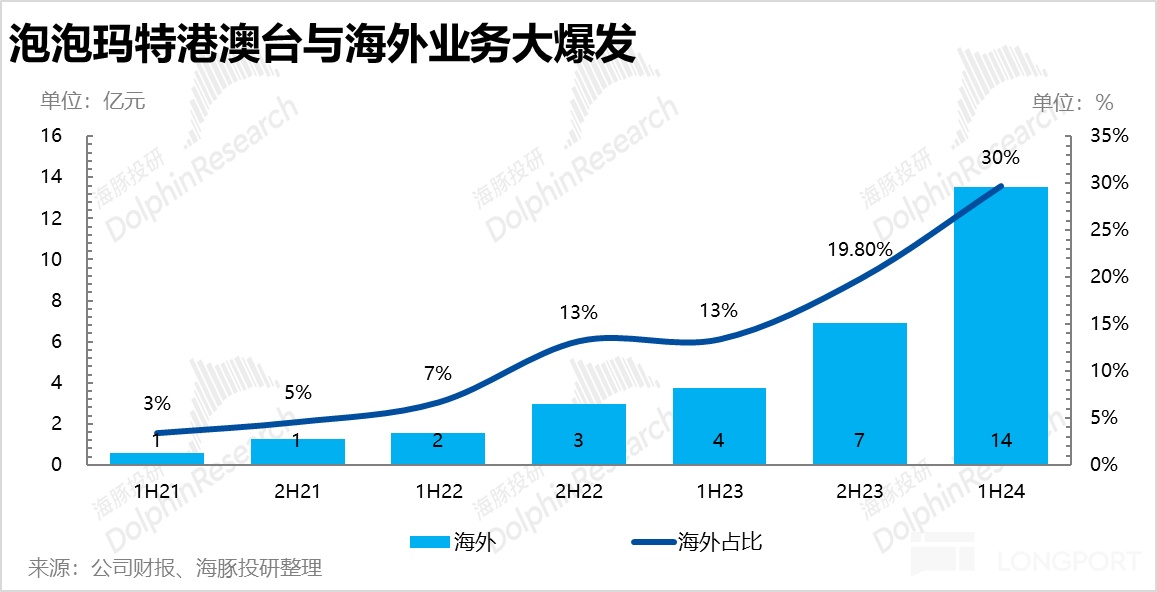 2022 年泡泡玛特开始认真把眼光投向海外,2023 年上半年才算开始铺了一点摊子,2023 年下半年海外开始收获了,到了今年上半年,海外(含港澳台)的收入占比直接拉到了 30%。13.5 亿的收入体量、260% 的同比增速,泡泡玛特算是彻底打响了海外市场。
