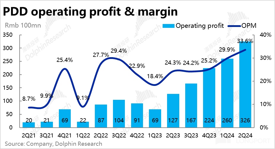 因为纯利润型收入还能够多增,再加上克制的销售费用,利润释放还是风火状态。二季度拼多多经营利润含 Temu 的亏损在内,已经稳定站上了 300 亿美金,这个季度达到了 326 亿美金,同比猛彪 156%。
