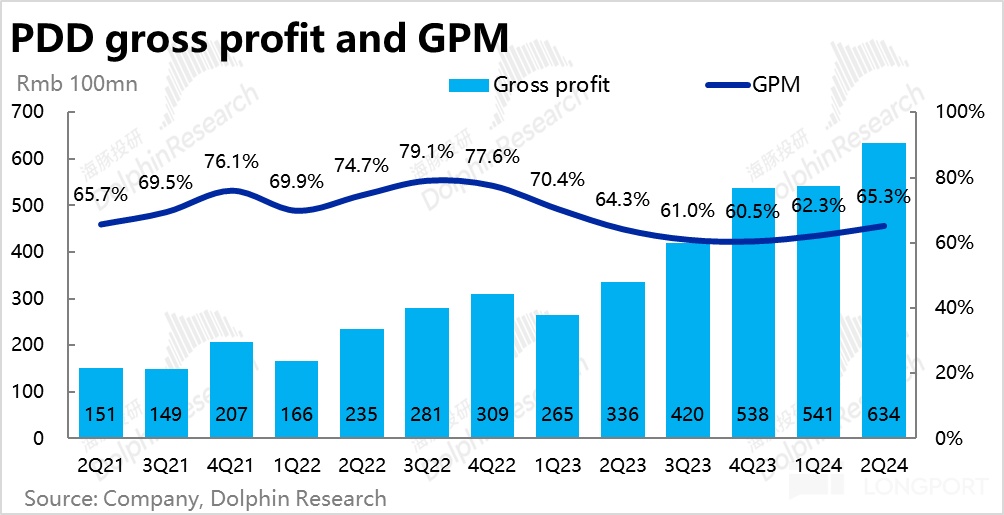 毛利角度,本季拼多多毛利率为 65.3%,过往几个季度因 Temu 的履约费用的拖累,毛利率一直是同比走低的。本季度是 Temu 起量后,拼多多的毛利率首次同比止跌,反增了约 1pct。