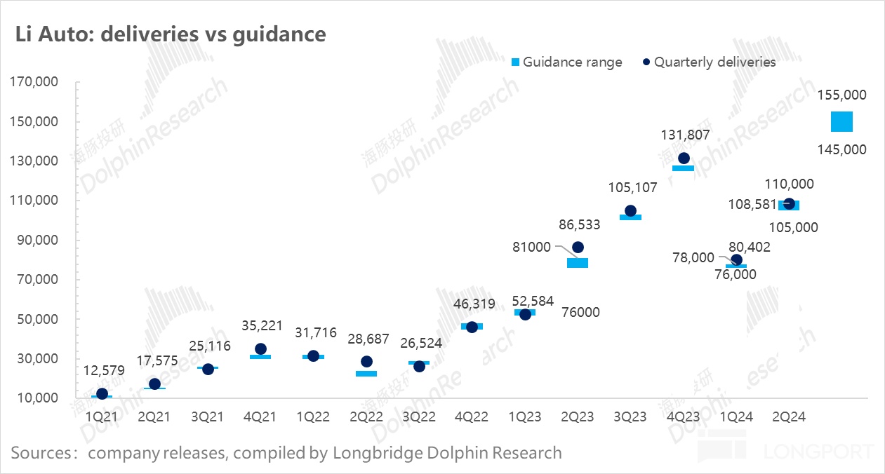 而理想给的三季度交付量指引为 14.5-15.5 万,相比二季度 10.9 万交付量环比上行 33%-42%,而海豚君认为这样的销量指引反而是一种不太自信的表现,这次指引的区间跟过往很大的不同的是:过往一般区间指引的高低差一般也就是两三千辆,结果这次直接上万辆,同时也低于海豚君预期的 15.6 万辆。