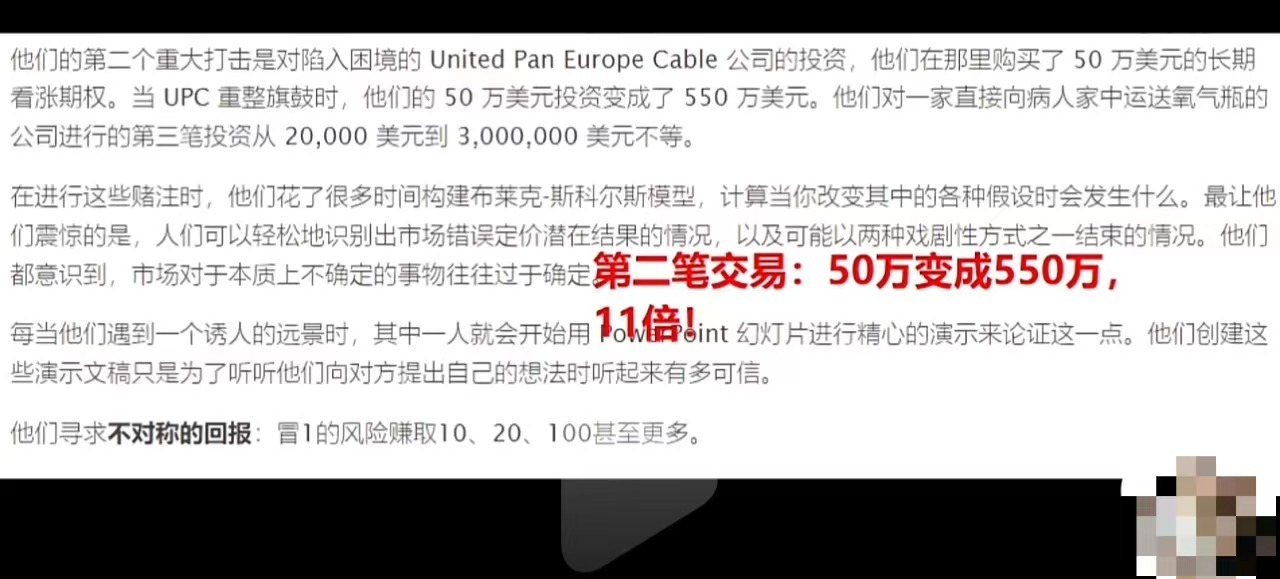 就是抄底那些被错杀的股票的期权,持仓周期是两三年,行情回来了,就会赚十几倍、几十倍,几轮下来,11 万就变 3000 万了。