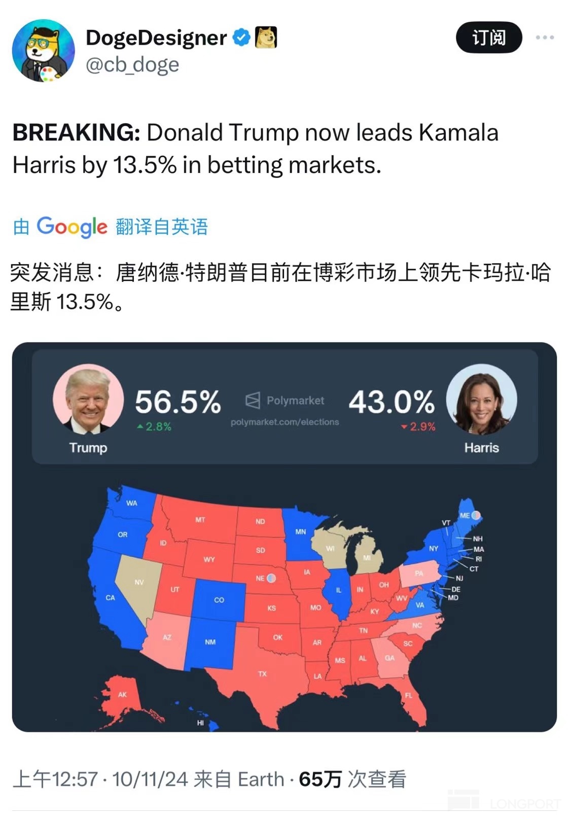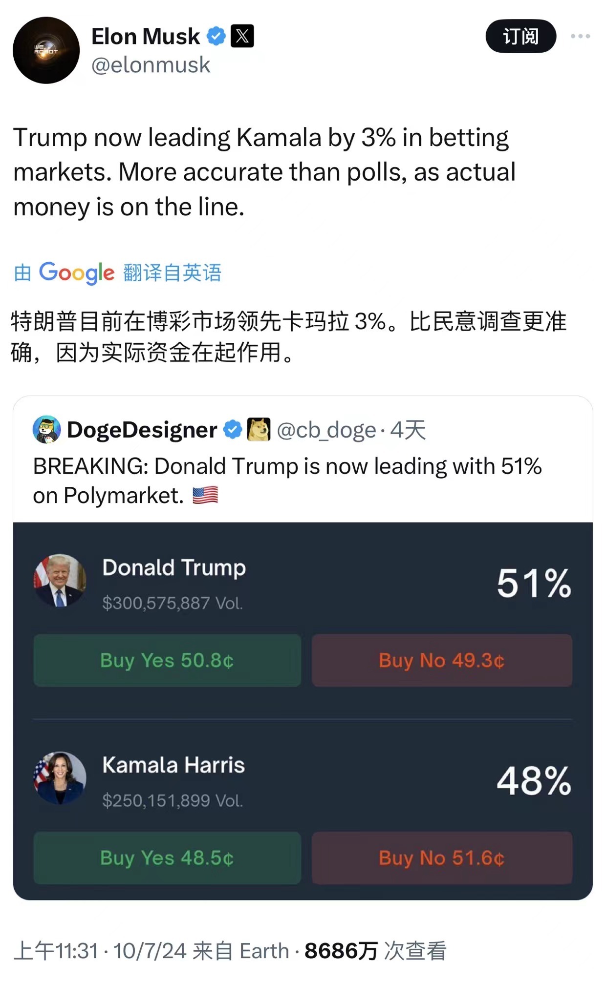 值得一提的是,马斯克在前几日也转发了相关信息,其表示,博彩市场比民意调查更准确,因为是实际资金起作用(注:马斯克立场是支持特朗普)。