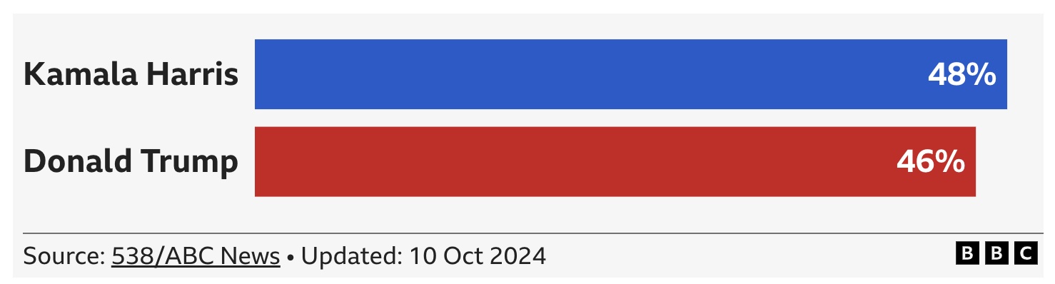 在 BBC 的民意调查中,特朗普胜选率低于哈里斯,分别为 46%、48%,不过差距较之前缩小(数据截止 10 月 10 日):
