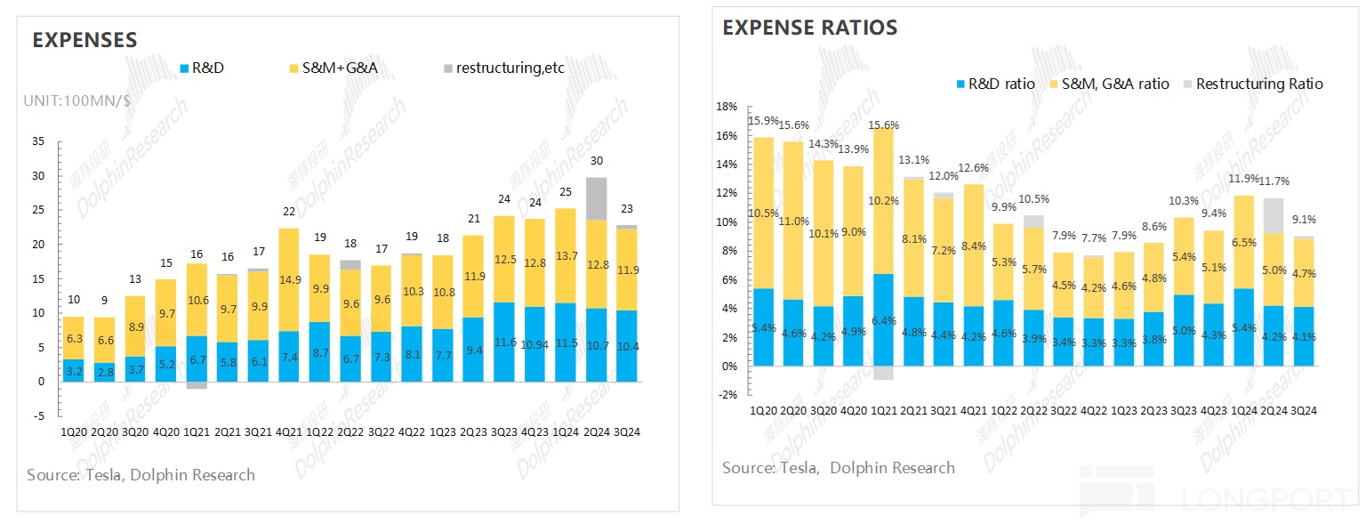 除了对于汽车产能的投入更谨慎了,特斯拉本季度的研发开支和销售费用开支都在严控,研发费用本季度 10.4 亿,低于市场预期 11 亿,而销售和行政费用本季度只有 11.9 亿,低于市场预期 13 亿,整体的费用端都低于市场预期,可能主要由于二季度裁员造成的人员数量减少,经营费用有所下降。