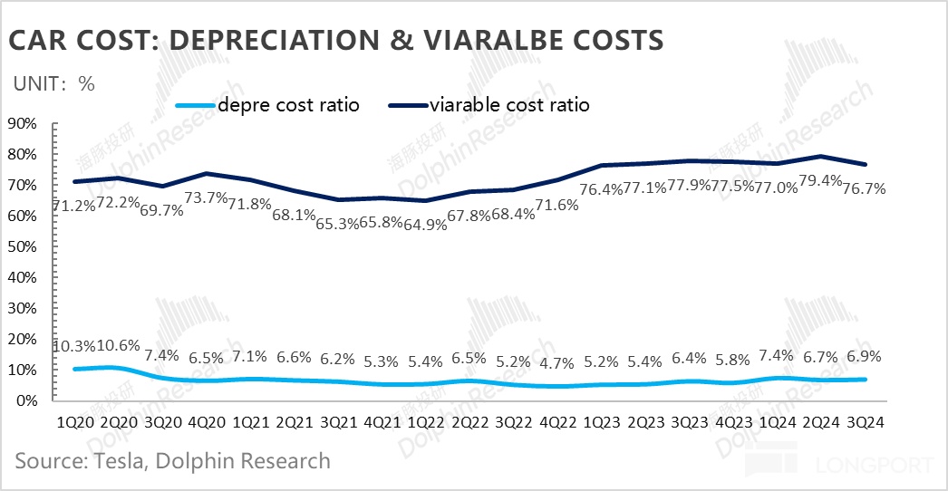 2) 单车可变成本:单车可变成本三季度是 3.2 万美金,环比降低约 1700 美元,成为本季度汽车业务毛利率端(去碳积分)提升最主要的原因,而海豚君认为单车可变成本的下滑可能的原因主要由: