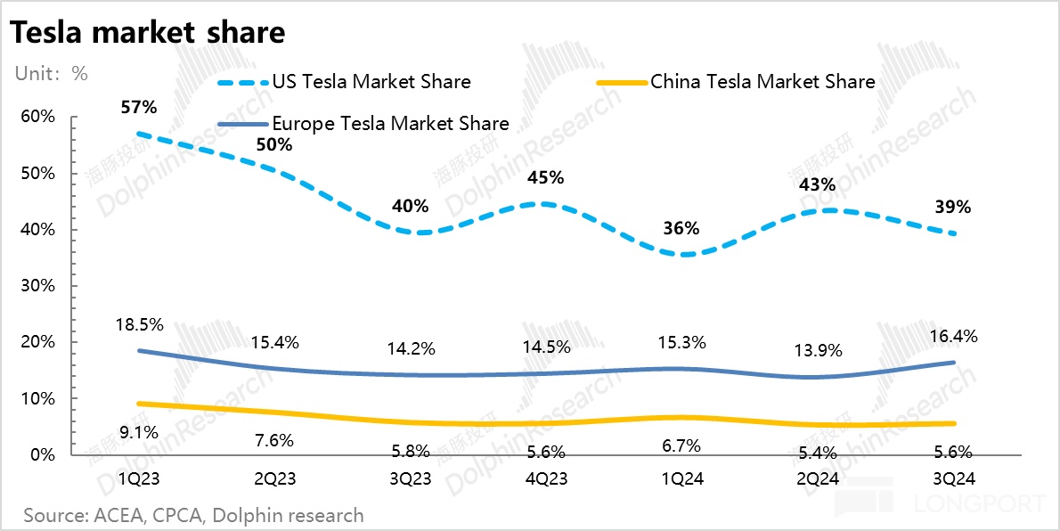 从造车的基本面来看,由于 Model 3/Y 车型老化,虽然特斯拉整体的卖车销量和市占率会随着卖车季节性周期(通常三四季度为卖车旺季)和价格/激励措施的调整有所波动,但拉长时间轴来看,特斯拉在不同地区整体的市占率都呈现了下滑的趋势,如果再没有新车型推出的刺激,造车基本面继续恶化无非就是时间问题,特斯拉急需下个增长引擎。
