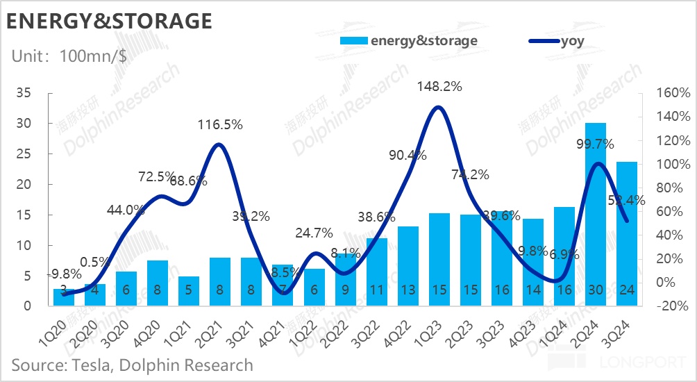 今年三季度实现营 24 亿美元,低于市场预期 26.5 亿美元,主要因为本季度的储能出货量有所下滑,本季度储能仅出货 6.9GWH,相比上季度 9.4GWH 环比下滑 27%,但储能偏项目制,季节性波动较大,而美国大储需求仍然强劲, 所以海豚君对于这块业务本季度的增长放缓并不担心。特斯拉也预计到 2024 年第四季度,储能业务装机量将继续环比增长,全年出货量有望实现同比翻番增长,意味着四季度储能出货量可能能重回 9GWH 左右,这块业务仍处于上行轨道中。