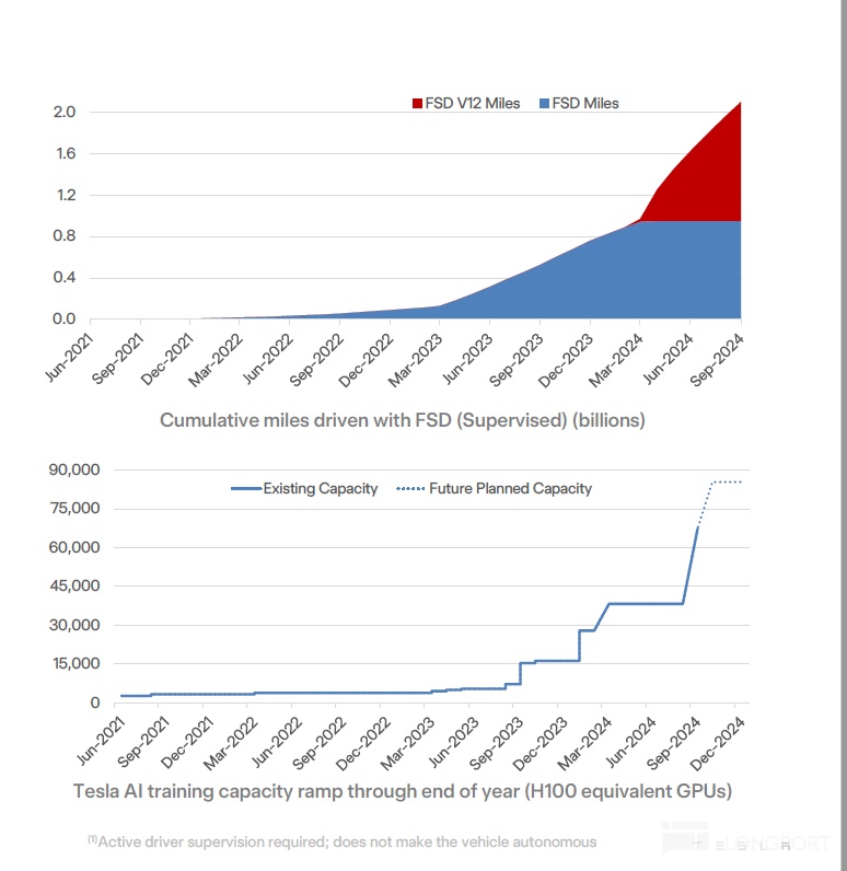 而在投资者还关注的 FSD 进度上,FSD 的渗透率提升关键在于价格方面的调整以及安全性的提升。在安全性方面,马斯克表示,相比 V12.5 版本,FSD V13 干预间的行驶里程将提高 5-6 倍。但在 FSD 的硬件端训练算力方面,由于部署的 GPU 增加(预计 10 月底将有 5 万张 H100 芯片),在硬件端的算力方面没有制约因素。