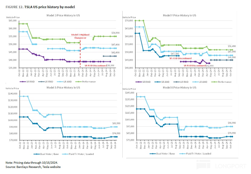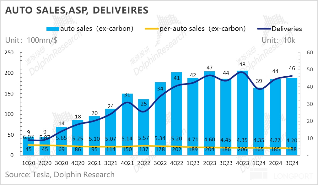 我们先从卖车的单价端来看,三季度,特斯拉每卖一辆车的收入(不含碳积分与汽车租赁销售)是 4.2 万美元,相比上个季度单价端环比下滑了约 730 美元,要低于市场预期。
