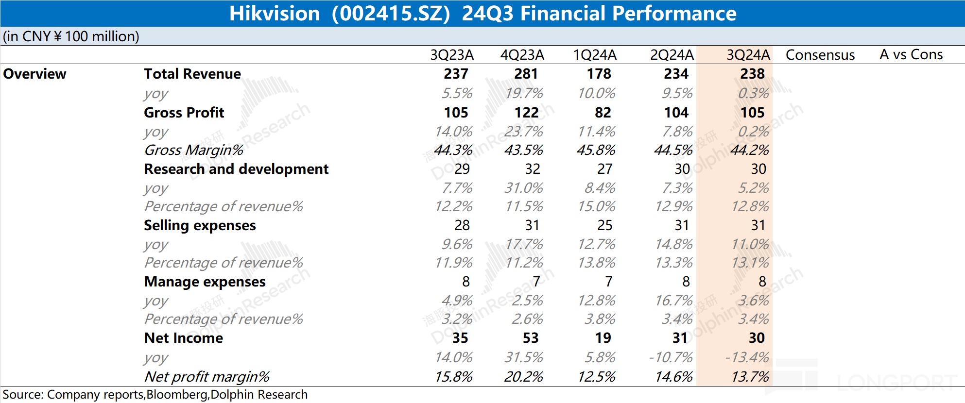 海康威视于北京时间 2024 年 10 月 25 日晚上的 A 股盘后发布了 2024 年第三季度财报(截止 2024 年 9 月),要点如下: