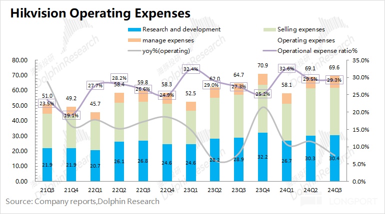 2.毛利及费用端:$海康威视(002415.SZ) 2024 年第三季度的毛利率 44.2%,同比微降 0.1pct。虽然营收和毛利率都保持相对平稳,但经营性费用本季度为 69.6 亿元,同比增长 7.5%,继续维持在相对高位。其中销售费用和研发费用是费用端上升的主要来源;