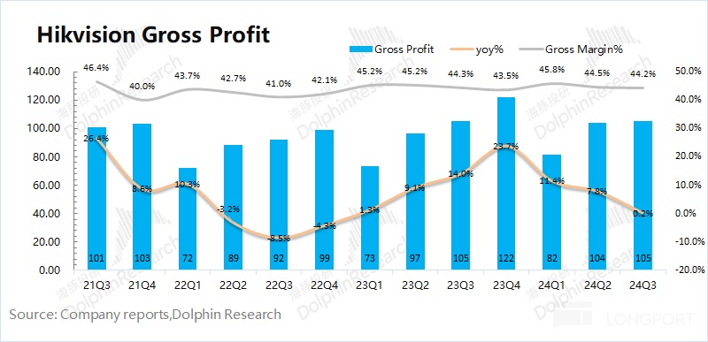 海康威视在 2024 年第三季度实现毛利 105 亿元,同比增长 0.2%。毛利增速与收入端接近。