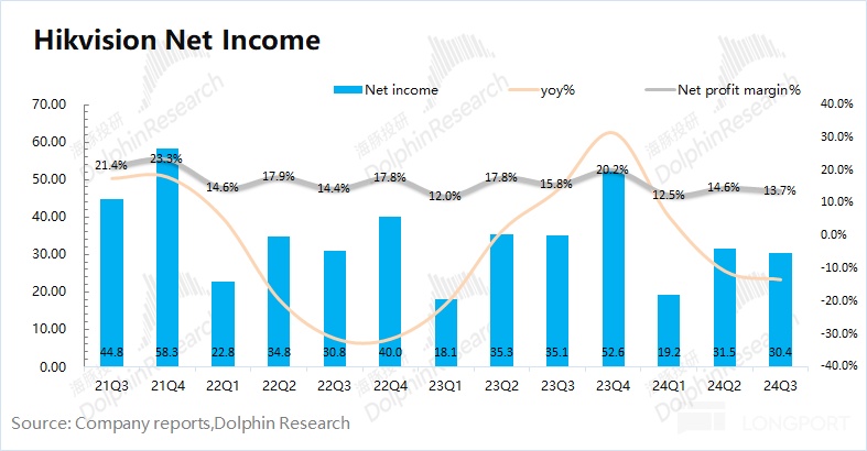 海康威视在 2024 年第三季度实现归母净利 30.4 亿元,同比下滑 13.4%。其中公司本季度公司净利率 13.7%,同比下滑 2.1pct。虽然营收端微增 0.3%,但费用端的提升等影响,公司最终本季度的利润有所下滑。